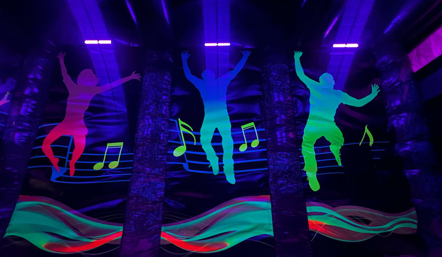 We just can't get enough of a blacklight dance zone and spacious bouncing area. Perfect for night events, glow parties, and retro-themed celebrations, the black light features glowing reactive vinyl designs that come alive under UV light.