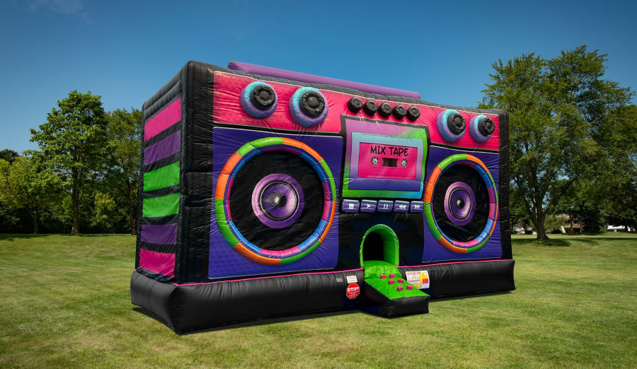 Crank up the volume and boogie down with Blue Sky Inflatables Boom Box Bounce House! – the ultimate throwback to the electrifying 80s! Our vendor has designed this inflatable to look like a giant, colorful boombox from the golden age of mixtapes and neon fashion, fabulous music and epic dance parties.