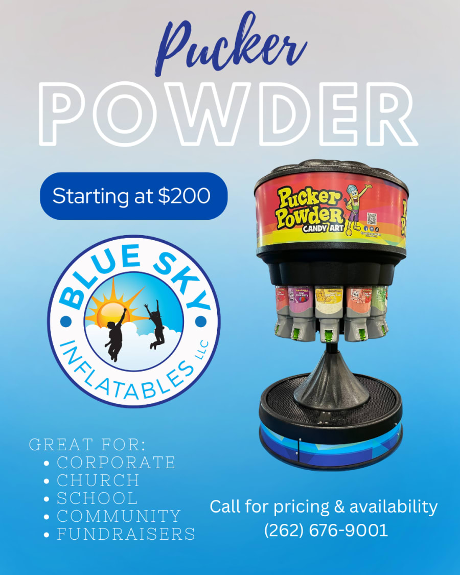 Blue Sky Inflatables now offers Pucker Powder Candy Art! We highly recommend this sweet treat for large events, school fundraisers, church or corporate! Kids of all ages will be able to create their own "candy art" with multiple flavor and color options. This commercial grade candy dispenser comes ready to operate for a fun and profitable addition to your event.