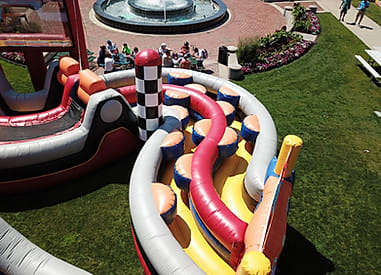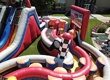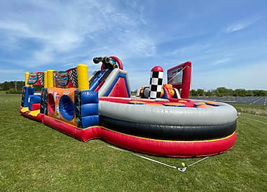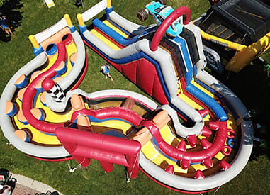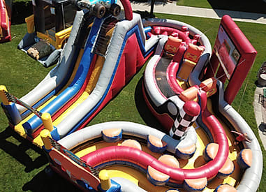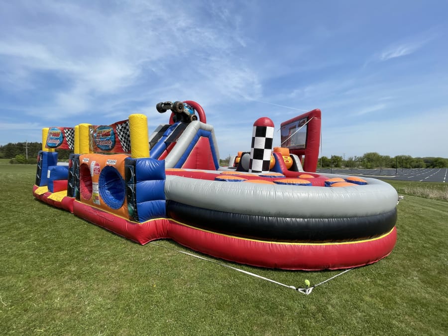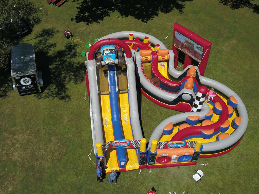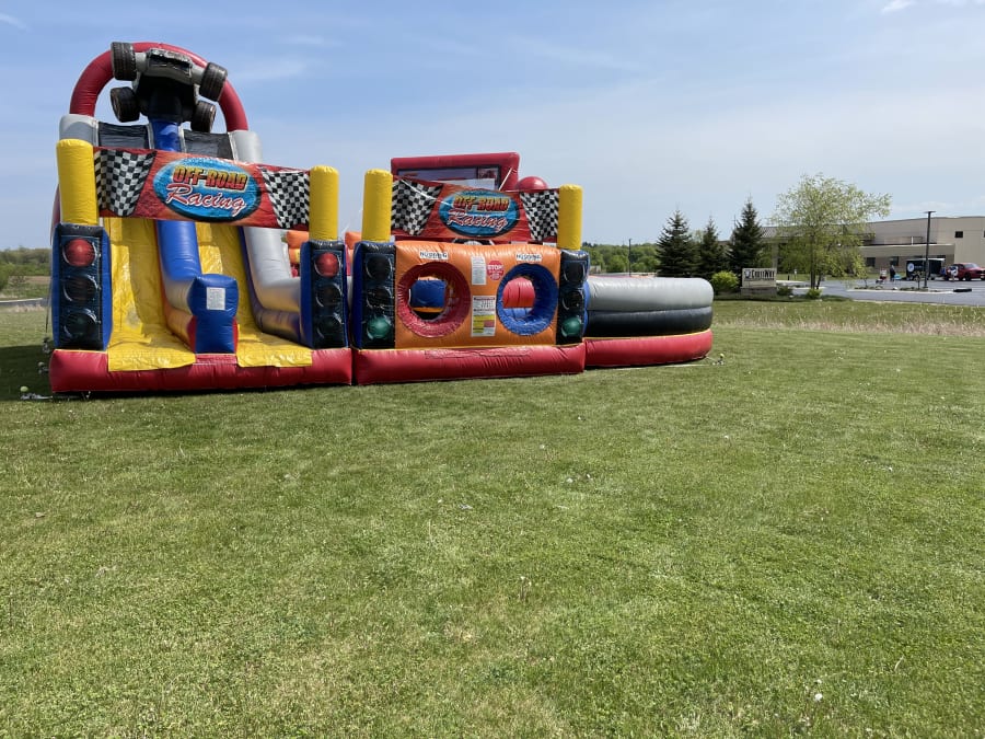 Rev up your engines for this monster off-road racing track. This inflatable unit has side-by-side winding curves and tough obstacles with hills to climb and valleys to traverse. Beat your competition to the slide and zoom past the finish line for the WIN! This unit is great for corporate events, school carnivals, and epic birthday parties. Vroom Vroom! Beep Beep!